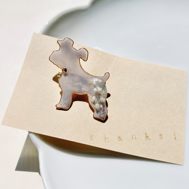 ミニチュアシュナウザーのレジンブローチ【ハンドメイド】 まるで小さな宝物。 凛とした佇まいが愛らしい、ミニチュアシュナウザーのハンドメイドブローチです。 ゴールドのワイヤーフレームで形取られたシュナウザーは、 ワイヤーアートならではの繊細なラインが魅力。 レジンを流し込み、毛並みの質感を表現しました。 表面はぷっくりつやつやにコーティング。 光が当たるたびに、柔らかな輝きを放ちます。 ジャケットやバッグ、帽子につけてワンポイントに。 シュナウザーや犬グッズが大好きな方や、ペットを大切にしている方への贈り物にもおすすめです。 ⸻ 【商品詳細】 ・素材:ワイヤー、レジン、ブローチピン(金属製) ・サイズ:約3.5cm × 約3.5cm(最大部) ・カラー:グレーホワイト×お花(毛色イメージ) ・コーティング:レジンコーティング済み(つやあり) ⸻ 【ご注文前にご確認ください】 ※ひとつひとつ手作業で製作しているため、模様や色の入り方が少しずつ異なります。 ※直射日光や高温多湿は避けて保管してください。 ※簡易ギフト包装をして発送致します。 ⸻ 「ちいさな“好き”が、日々の癒しになりますように」 そんな想いを込めて、心を込めてお届けします。 ミニチュアシュナウザー シュナ schnauser シュナウザーグッズ ミニチュアシュナウザーアクセサリー 犬好きプレゼント ハンドメイドブローチ ペットロスプレゼント